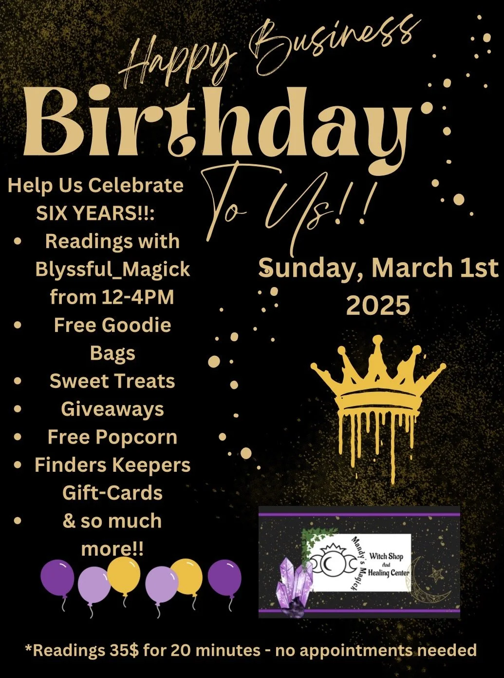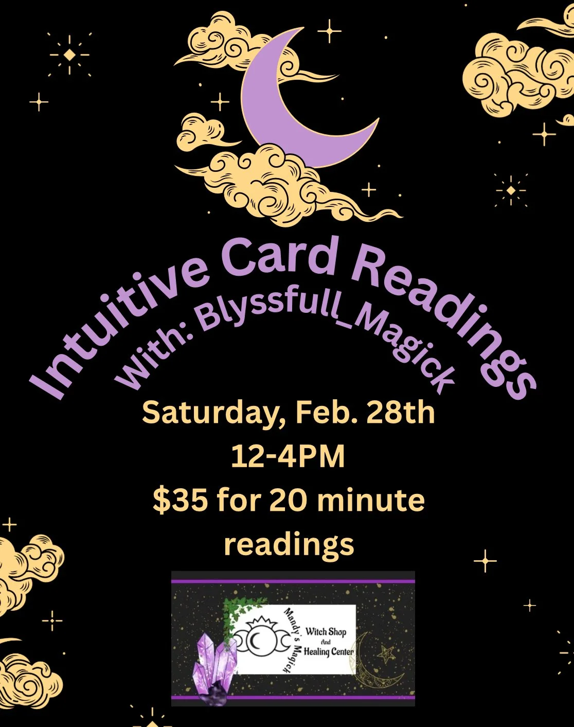 Saturday, Feb. 28th - Readings with Blyssful Magick (No appointments needed (12-4). 15 minute readings 35$
