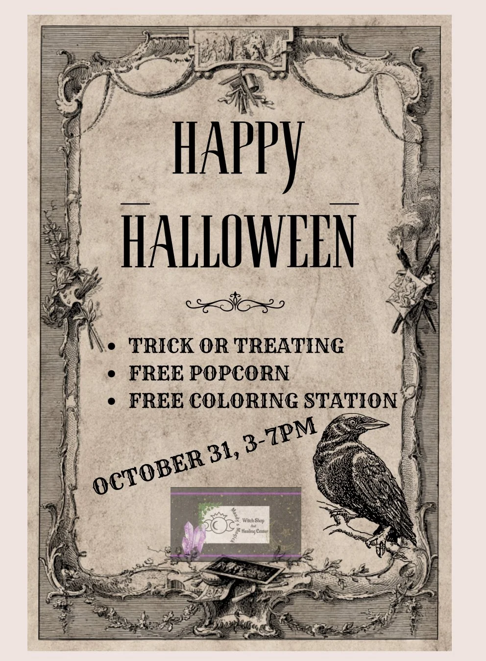 Come hang out with us on Saturday Oct. 25th 2-6pm for Two Spooky Selfie Stations, the Prize Wheel, Sweet Treats, PopCorn and Themed coloring pages! This FREE event is fun for all ages! 🎃 👻👑