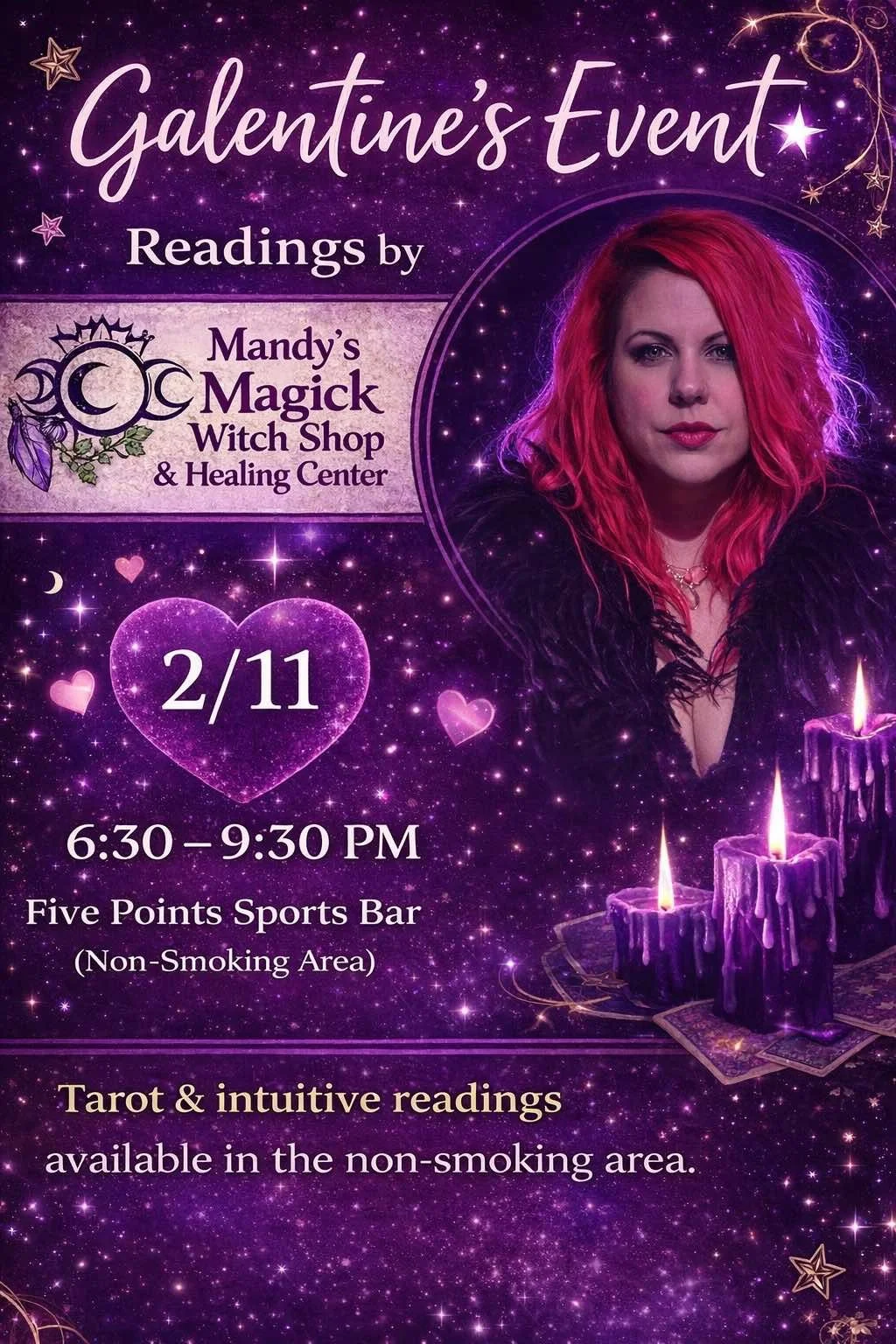 Wed. Feb. 11th - Mandy Magick - Readings at Galentine's Event @ Five Points Sports Bar (7:30) (Witch Shop still open until 7pm)